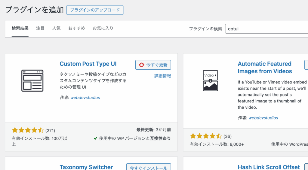 WordPressのメニューから「プラグイン->プラグインを追加」を選択して、右上の検索フォームに「cptui」と入力して検索すると表示されるのでインストールして有効化してください。