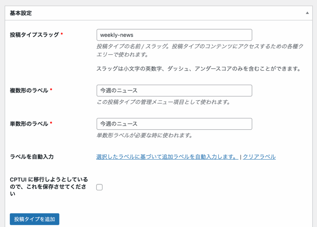 入力できたら、「投稿タイプを追加」というボタンを押してカスタム投稿タイプを作成します。